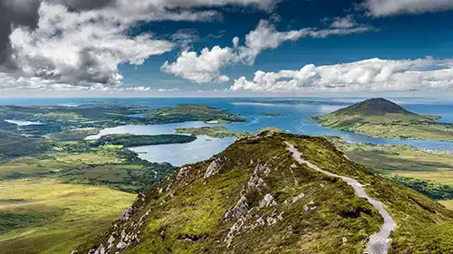 Via de panoramische Sky Road bij Clifden krijg je spectaculaire uitzichten op de Atlantische kust. Wie wil, bezoekt Connemara National Park: moerassen, bossen en heuvelruggen met wandelpaden, waaronder Diamond Hill, een van de mooiste viewpoints van West-Ierland.
